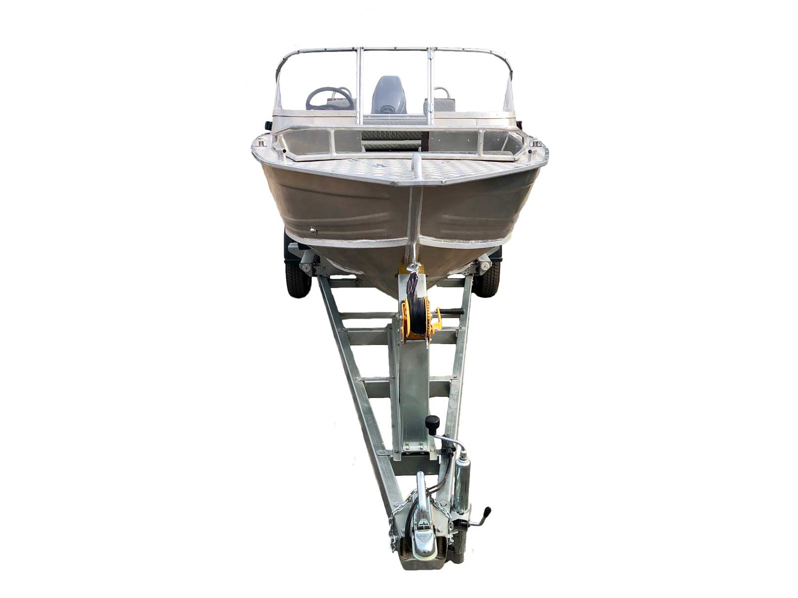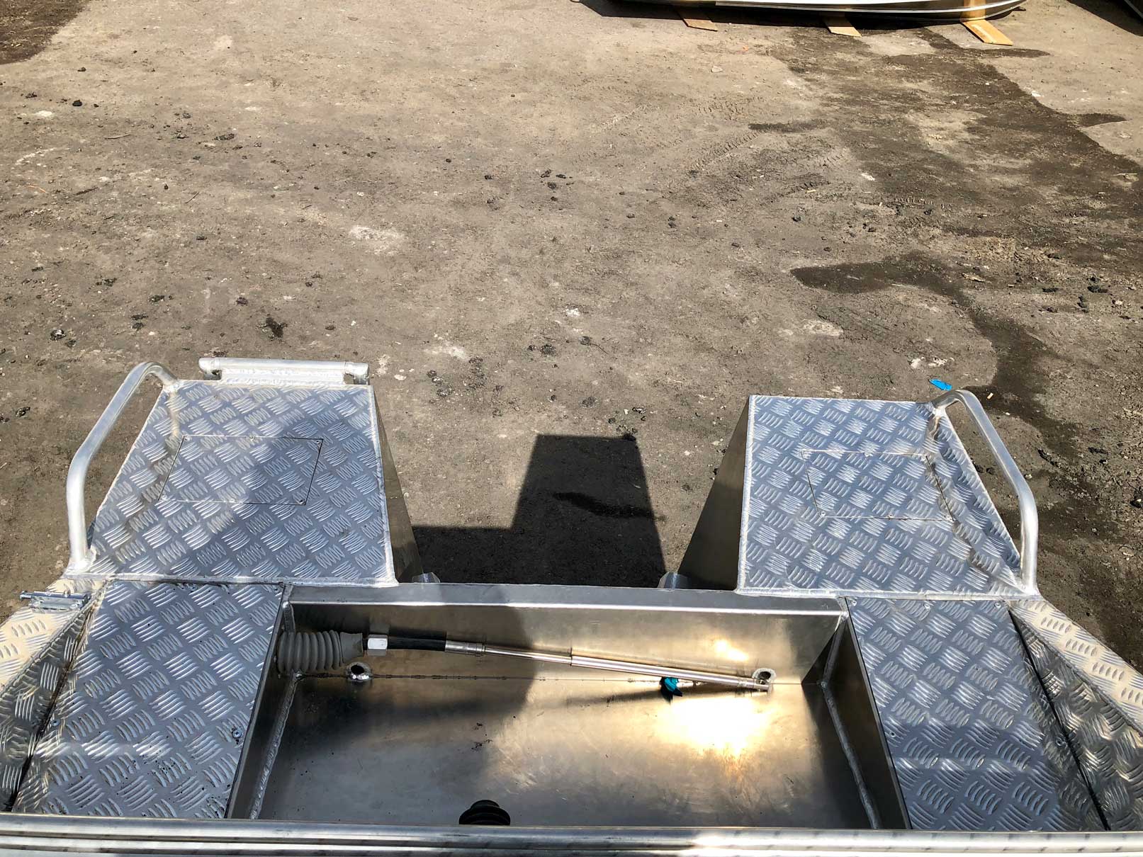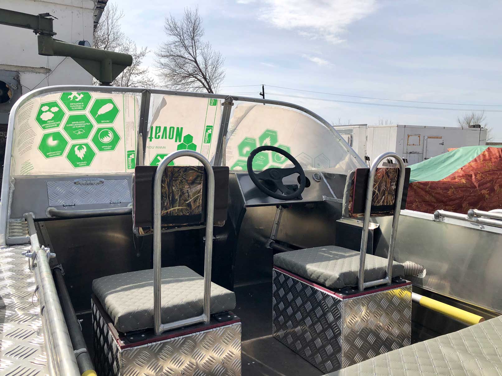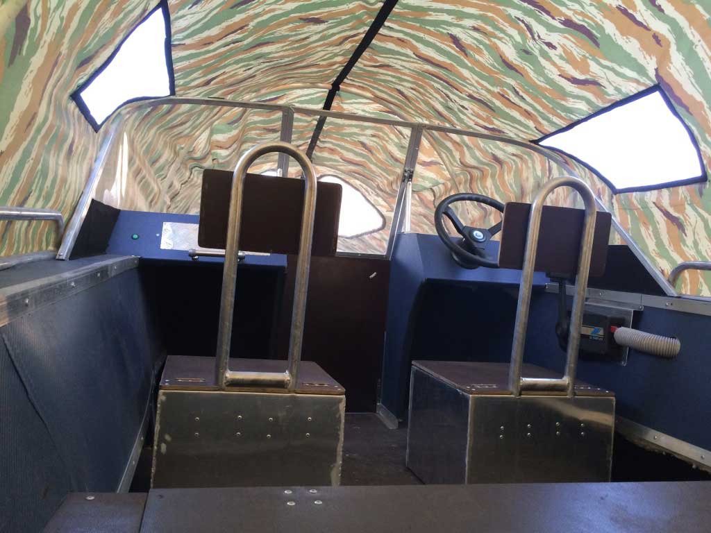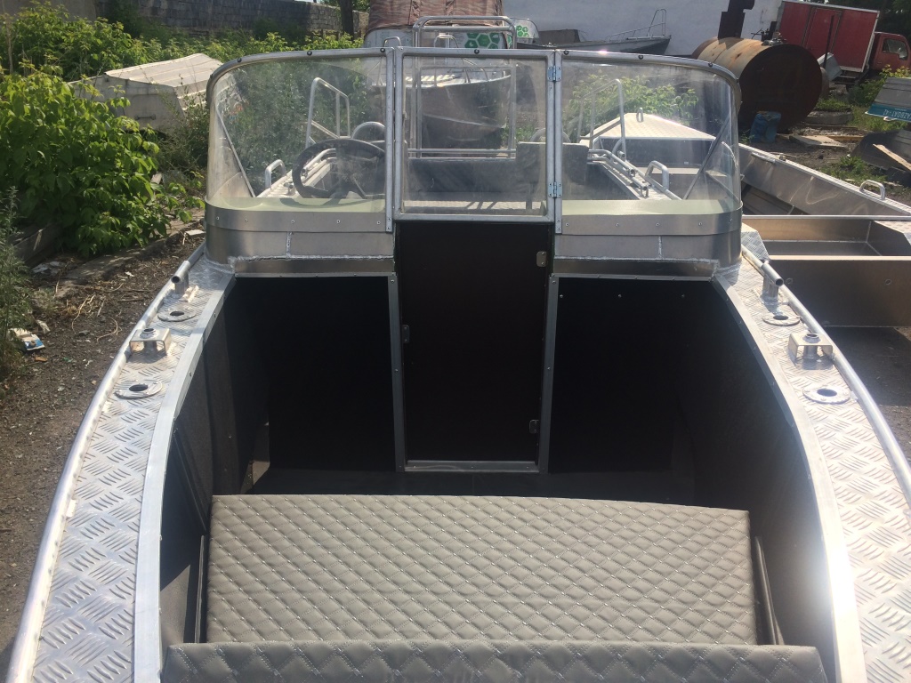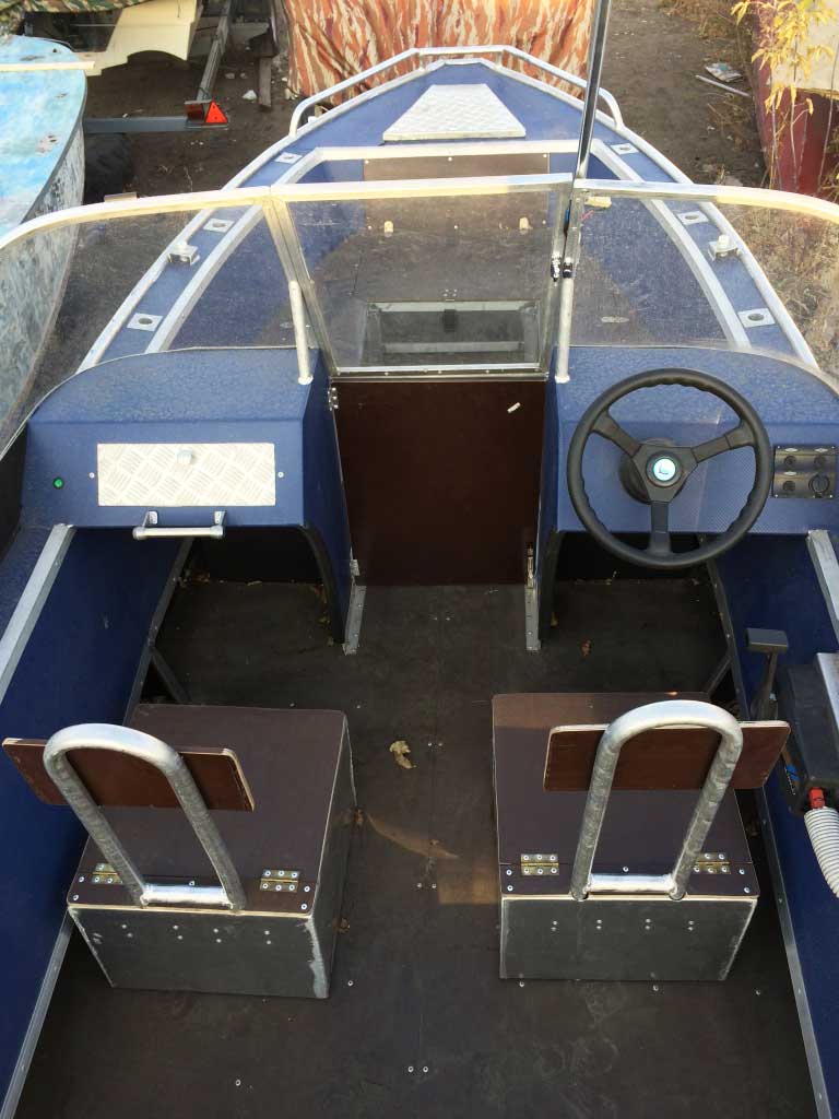 - Алюминиевая панель управления катером состоящая из двух консолей, в комплекте (рулевой редуктор, штурвал, рулевой трос, дверца прохода в носовой кокпит)