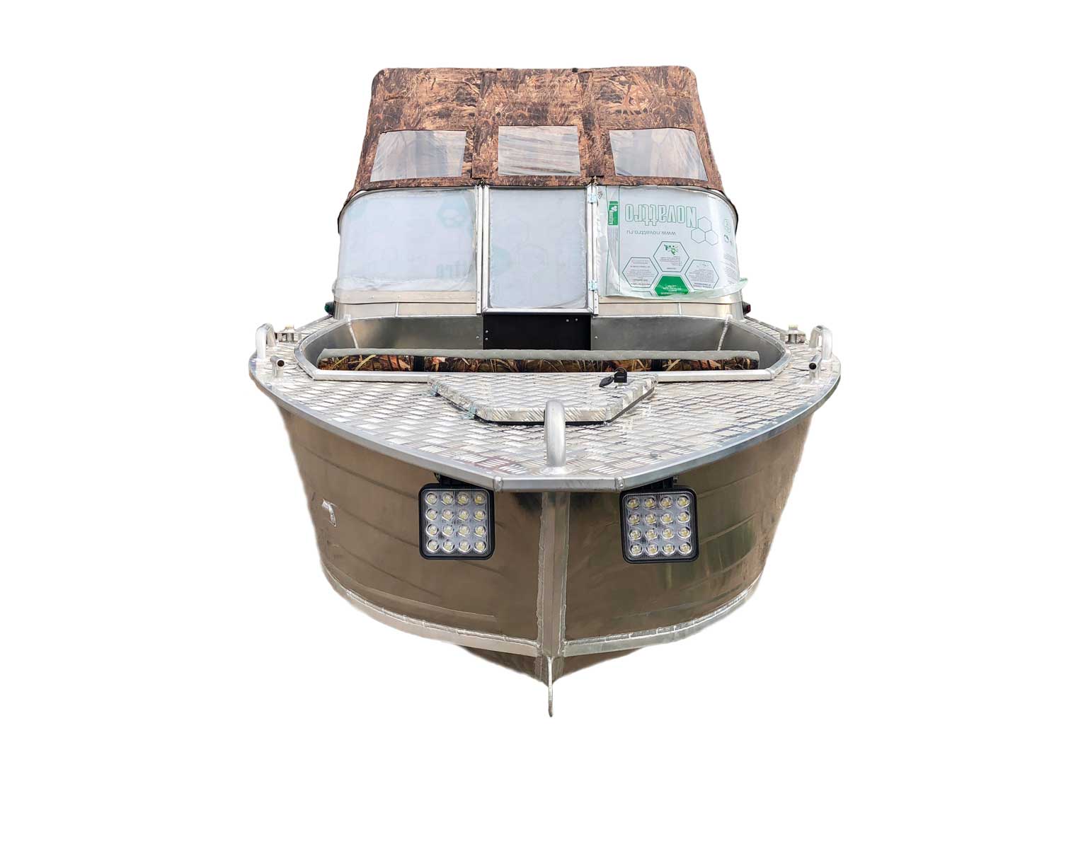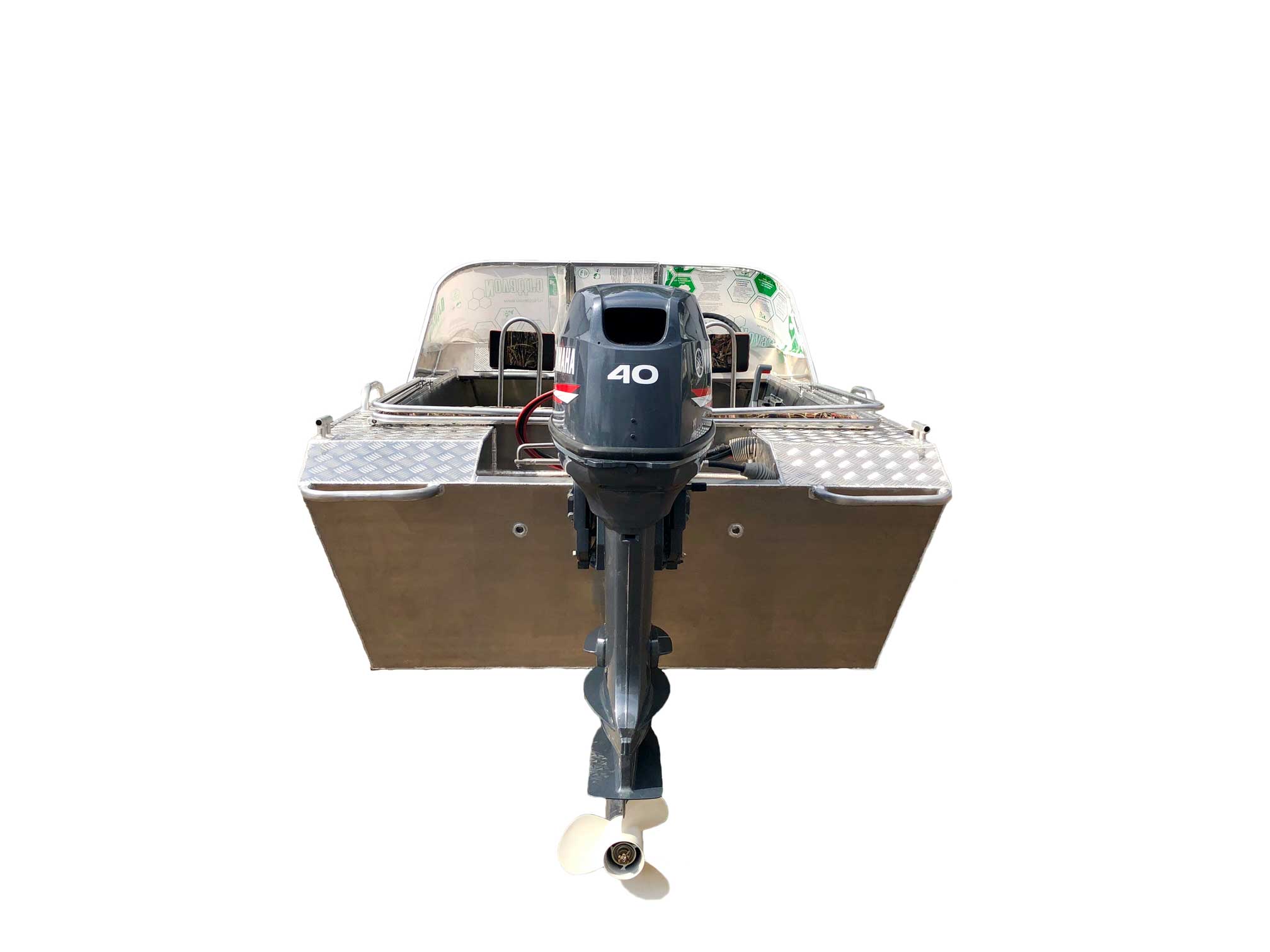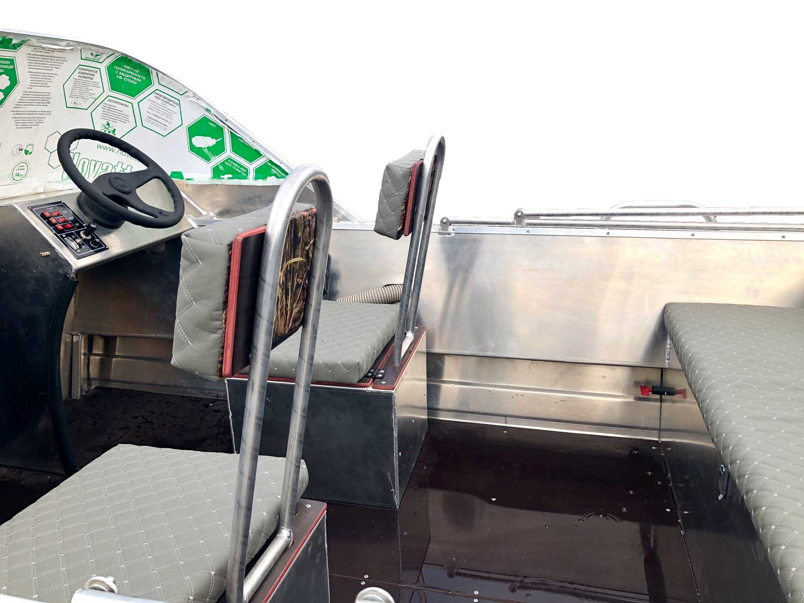 - Алюминиевая панель управления катером состоящая из двух консолей, в комплекте (рулевой редуктор, штурвал, рулевой трос, дверца прохода в носовой кокпит)